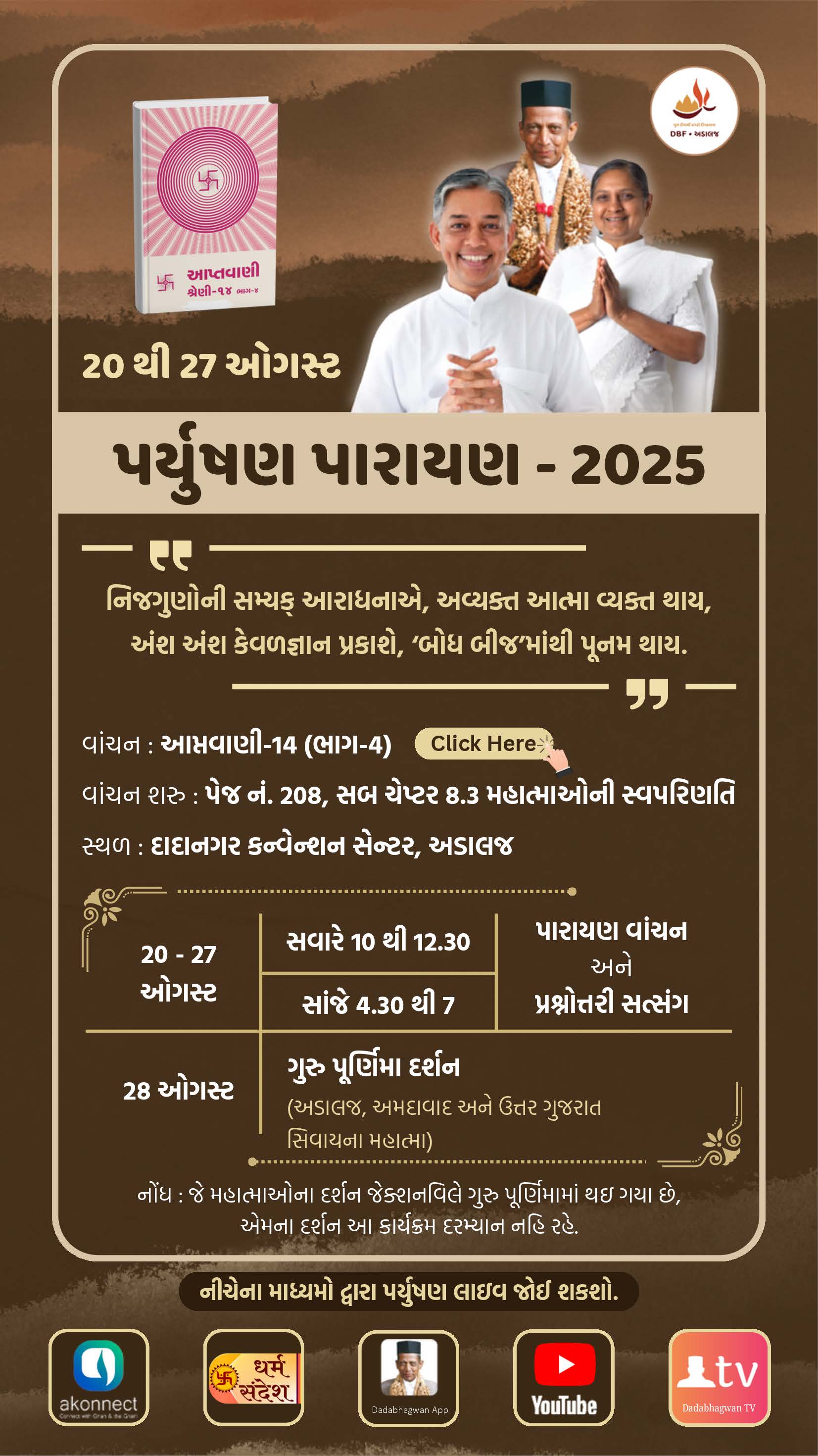 આરંભ: 07-Sep-2026 પુર્ણાહુતી: 16-Sep-2026સ્થળ: Adalaj સેવા ફોર્મ: લાઇવ